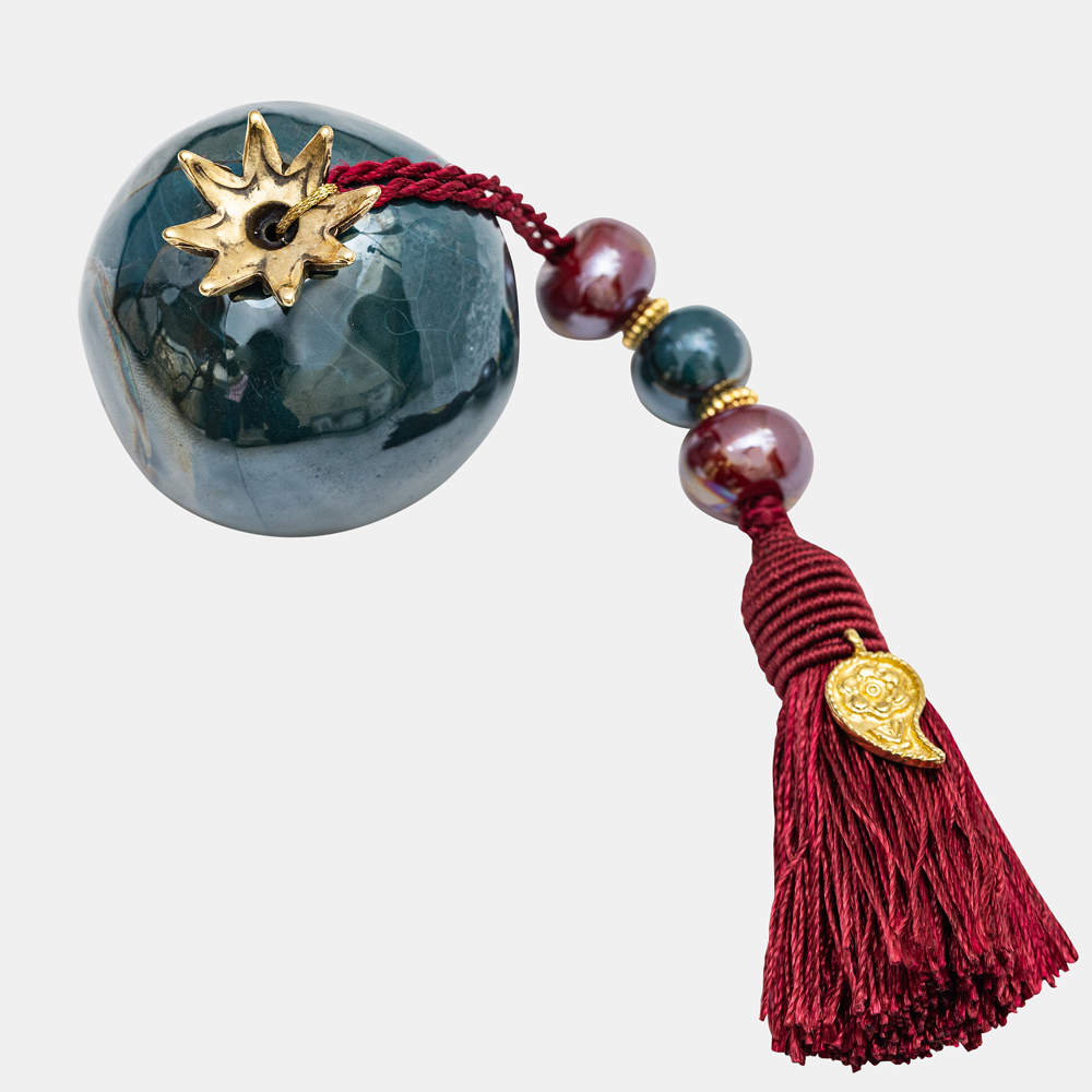 Table decoration in the shape of a pomegranate. It is decorated with a leaf-shaped pendant (tetramidi) from a gold-plated necklace. (Euboea, 19th c.)