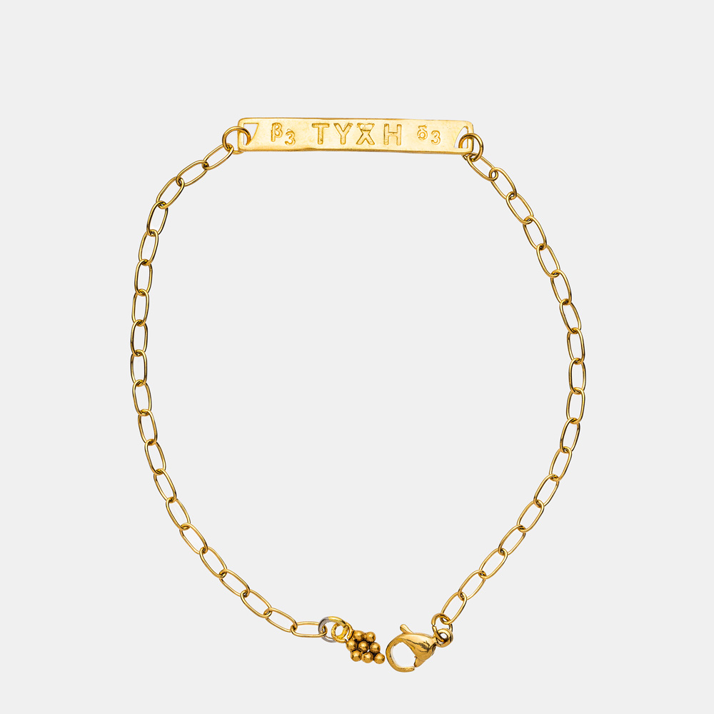 Identity bracelet bearing the inscription “fortune” in Greek (τύχη). «τύχη» is also written with the cryptographic communication code of the Filiki Eteria («β3δ3»). The Filiki Eteria was the secret organization that prepared the Greek War of Independence.