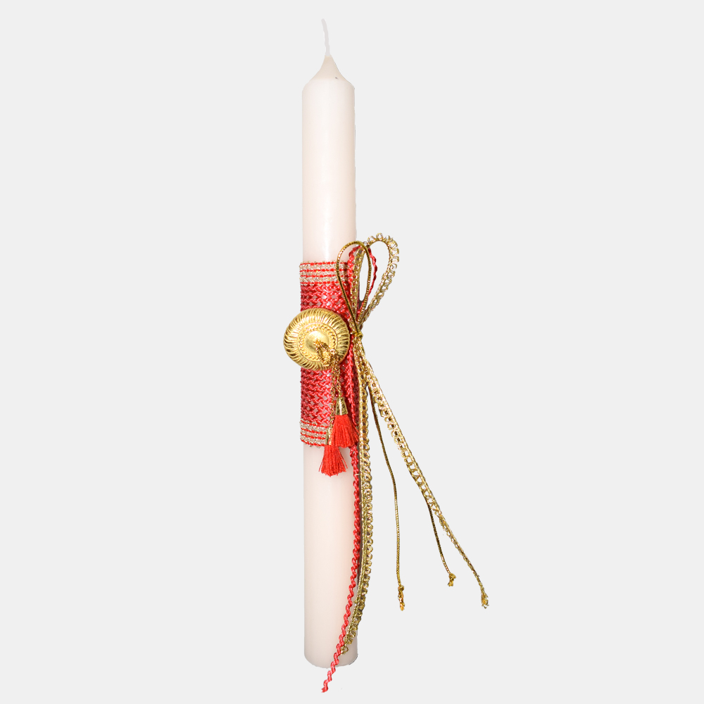 Λαμπάδα που διακοσμείται με κόσμημα (καρφίτσα), εμπνευσμένο από χρυσοστόλιστο φεσάκι με φούντα, φορεσιάς των Ιωαννίνων (18ος αι.).