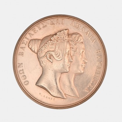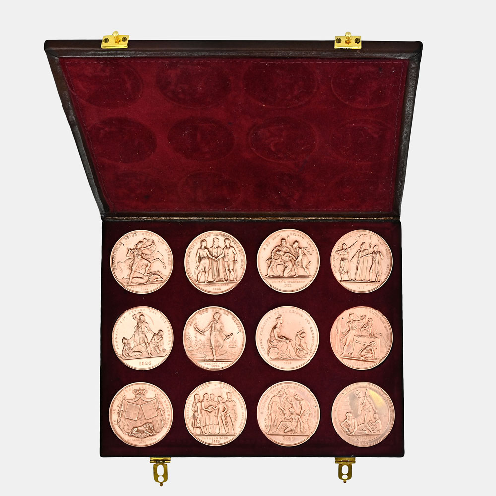 Case including twelve commemorative medals by the Bavarian engraver Konrad Lange (1806-1856), dedicated to significant figures of the Greek War of Independence. Observe: Archbishop of Patras Germanos, Petros Mavromichalis, Alexandros Mavrokordatos, Theodoros Kolokotronis and Nikitas Stamatelopoulos, Markos Botzaris, Georgios Koundouriotis, Andreas Miaoulis, Ioannis Kolettis, Spyridon Trikoupis, Ioannis Kapodistrias, Otto, Otto and Amalia. Reverse: scenes from historic events related to these figures.