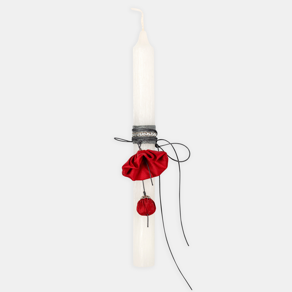 Λαμπάδα που διακοσμείται με υφασμάτινο χειροποίητο κόσμημα λαιμού σε σχήμα άνθους ανεμώνης. Τη διακόσμηση συμπληρώνουν κορδέλα και κορδόνι.