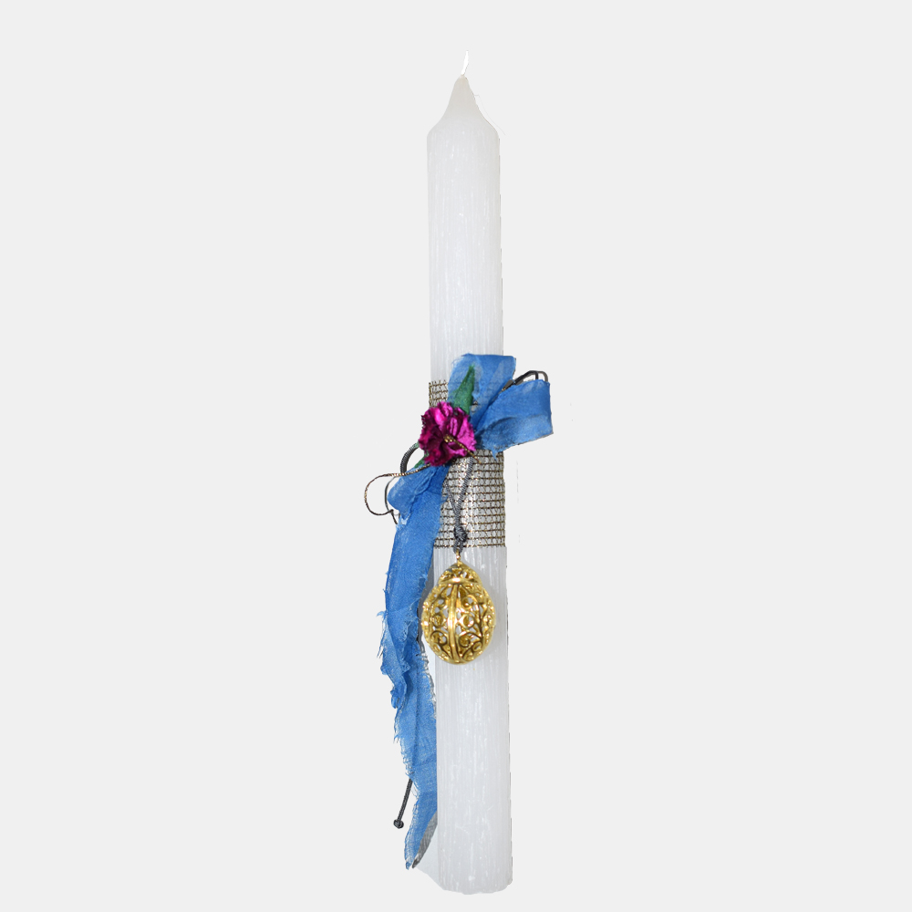 Λαμπάδα που διακοσμείται με πασχαλινό αυγό - κόσμημα λαιμού και κορδέλες.