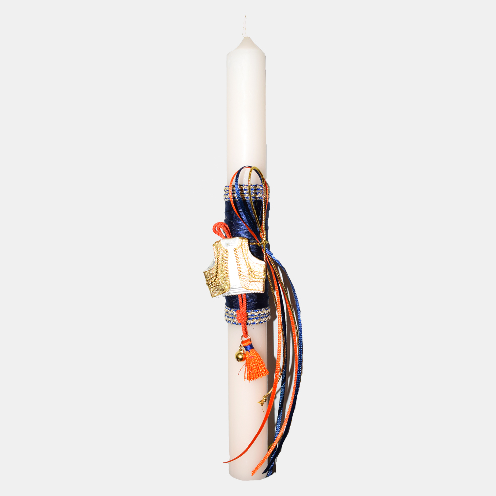 Λαμπάδα που διακοσμείται με κόσμημα εμπνευσμένο από χρυσοκέντητο γιλέκο αγωνιστή του 1821.