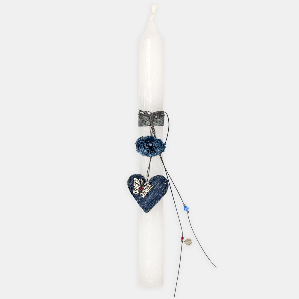 Λαμπάδα που διακοσμείται με υφασμάτινο χειροποίητο κόσμημα λαιμού σε σχήμα καρδιάς και ασημένια πεταλούδα. Τη διακόσμηση συμπληρώνουν κορδέλα και κορδόνι.